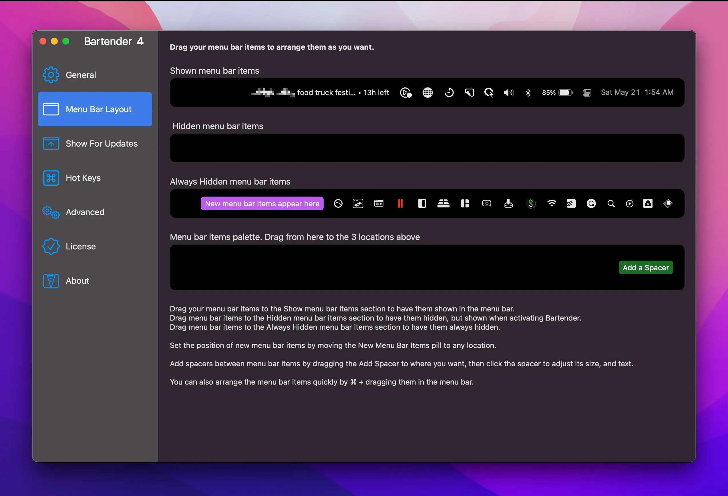 Many of the apps that show up in the menu bar are just for tweaking settings that you will most likely set once and never touch again. Bartender 4 allows you to decide what shows up in your menu bar and when.